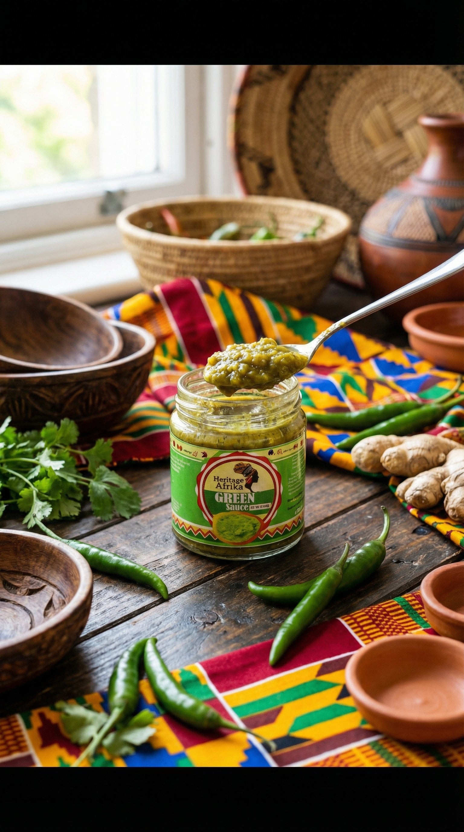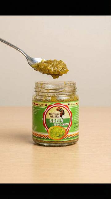 Heritage Afrika Green Sauce is a bold and vibrant West African pepper condiment designed to elevate your meals. Made with green peppers, green chilli, spring onion, ginger and garlic, this savoury sauce delivers fresh heat and aromatic depth in every spoonful. It is perfect as a table condiment for rice, grilled meats, fish, eggs and savoury dishes. Halal certified and proudly produced in the UK, Heritage Afrika Green Sauce brings authentic flavour to your table.
