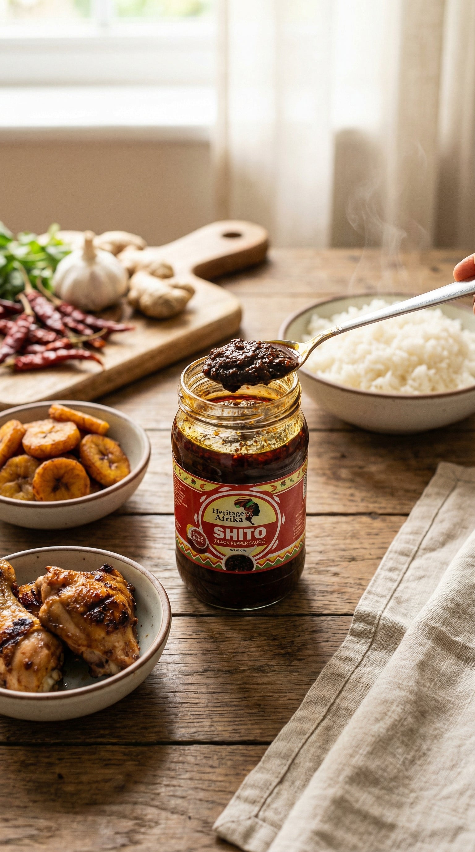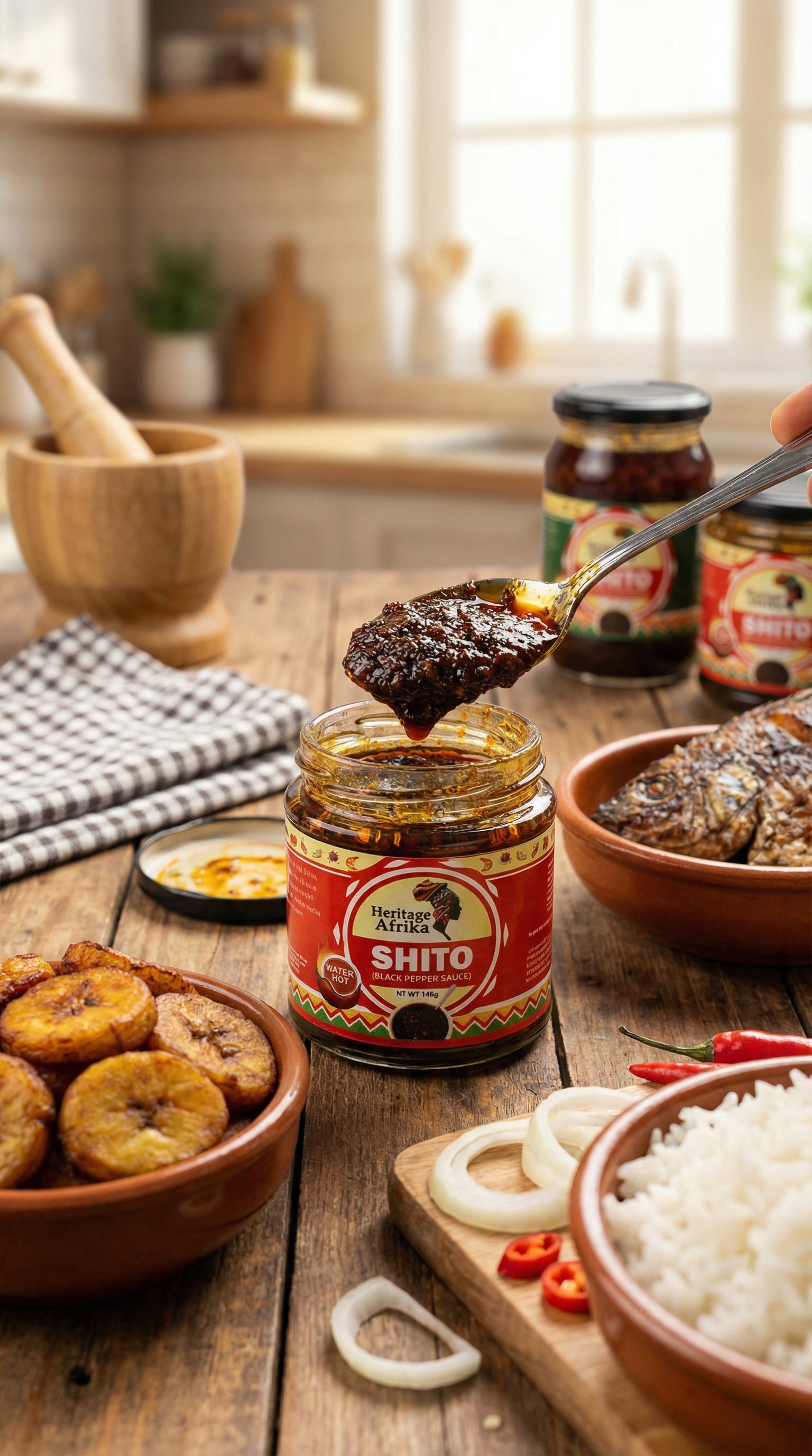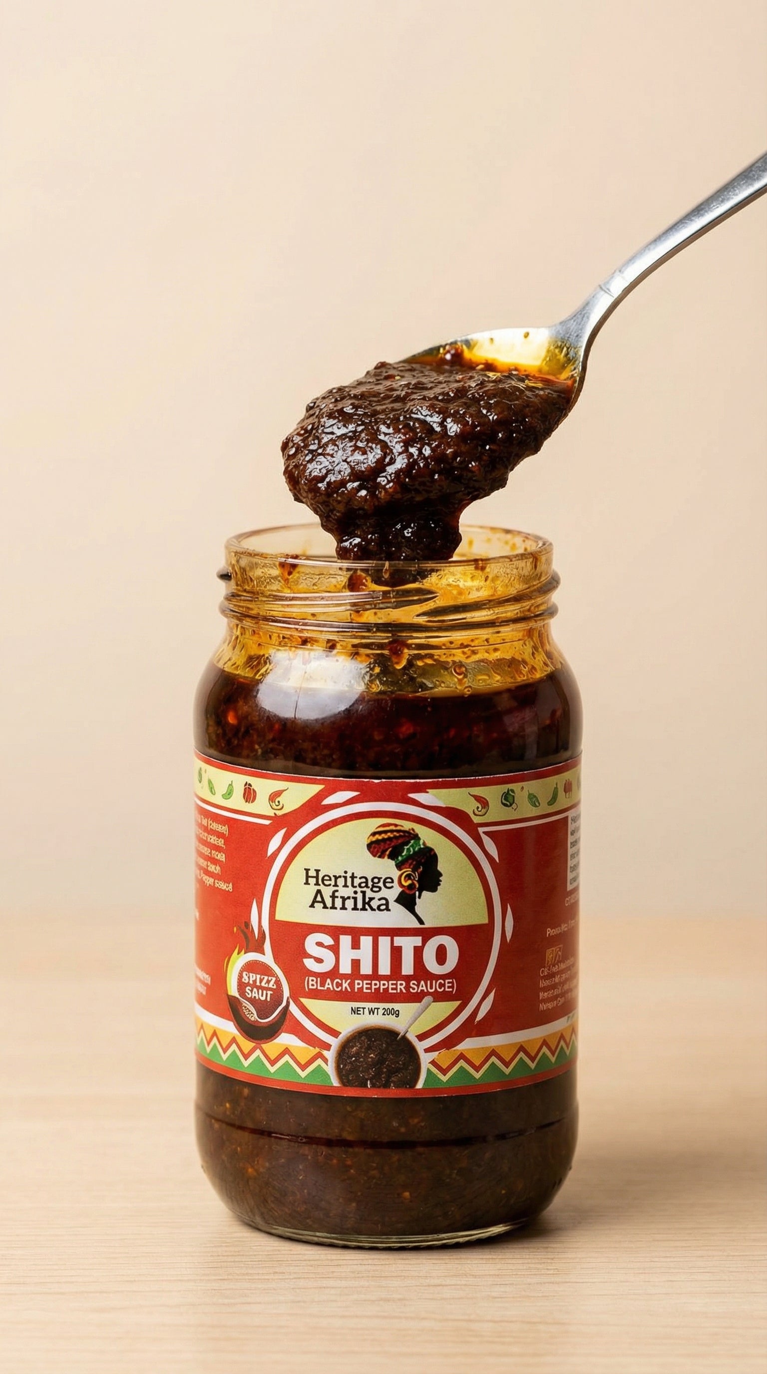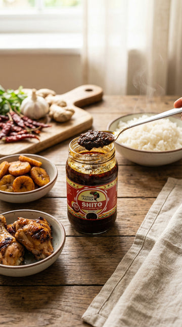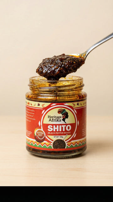 Premium Shito sauce for classic African taste. Serve with rice, yam, or bread. Ready to eat in minutes – perfect for busy families, meal prep, students, or anyone craving homemade taste. Produced in a facility that processes peanuts, dairy, and crustaceans. Store in a cool, dry place. Once opened, refrigerate and use within 7 days. Try our other Heritage Afrika meals for more authentic African cuisine!